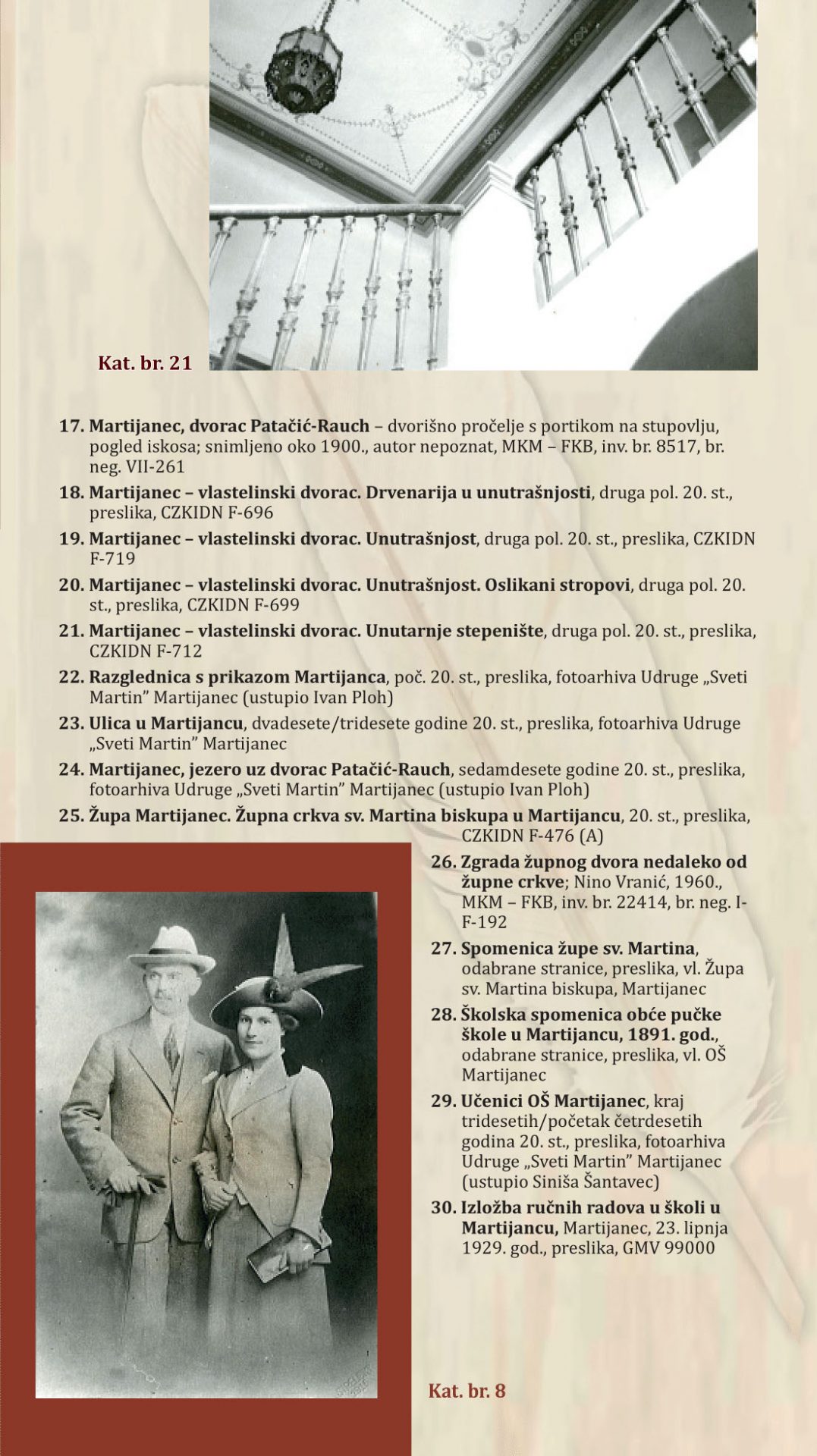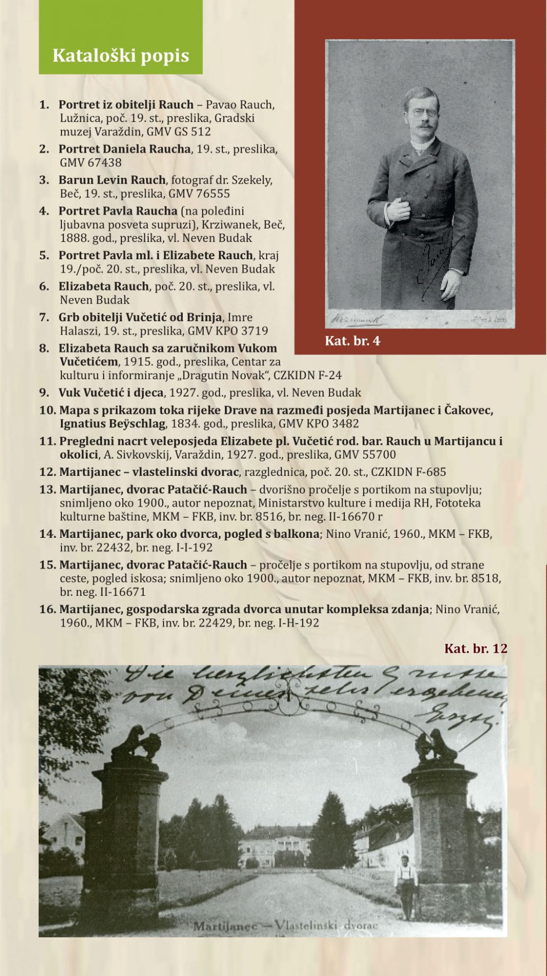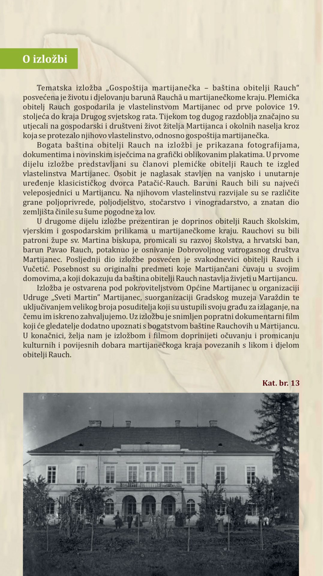Bogata baština obitelji Rauch na izložbi je prikazana fotografijama, dokumentima i novinskim isječcima na grafički oblikovanim plakatima. U prvome dijelu izložbe predstavljeni su članovi plemićke obitelji Rauch te izgled vlastelinstva Martijanec. Osobit je naglasak stavljen na vanjsko i unutarnje uređenje klasicističkog dvorca Patačić – Rauch. Baruni Rauch bili su najveći veleposjednici u Martijancu. Na njihovom vlastelinstvu razvijale su se različite grane poljoprivrede, poljodjelstvo, stočarstvo i vinogradarstvo, a znatan dio zemljišta činile su šume pogodne za lov.
