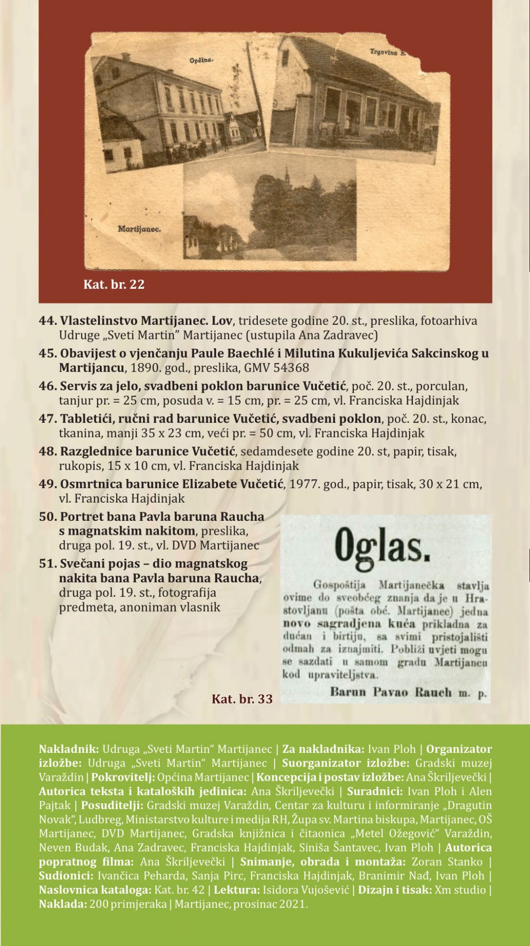 U drugome dijelu izložbe prezentiran je doprinos obitelji Rauch školskim, vjerskim i gospodarskim prilikama u martijanečkome kraju. Rauchovi su bili patroni župe sv. Martina biskupa, promicali su razvoj školstva, a hrvatski ban, barun Pavao Rauch, potaknuo je osnivanje Dobrovoljnog vatrogasnog društva Martijanec. Posljednji dio izložbe posvećen je svakodnevici obitelji Rauch i Vučetić. Posebnost su originalni predmeti koje Martijančani čuvaju u svojim domovima, a koji dokazuju da baština obitelji Rauch nastavlja živjeti u Martijancu.